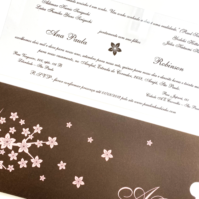 Todos os nossos convites são personalizados, ou seja, você escolhe o modelo, papel, cor, impressão e detalhes de acabamento para que o convite represente a sua essência, seu estilo e prepare o seu convidado para este momento especial.